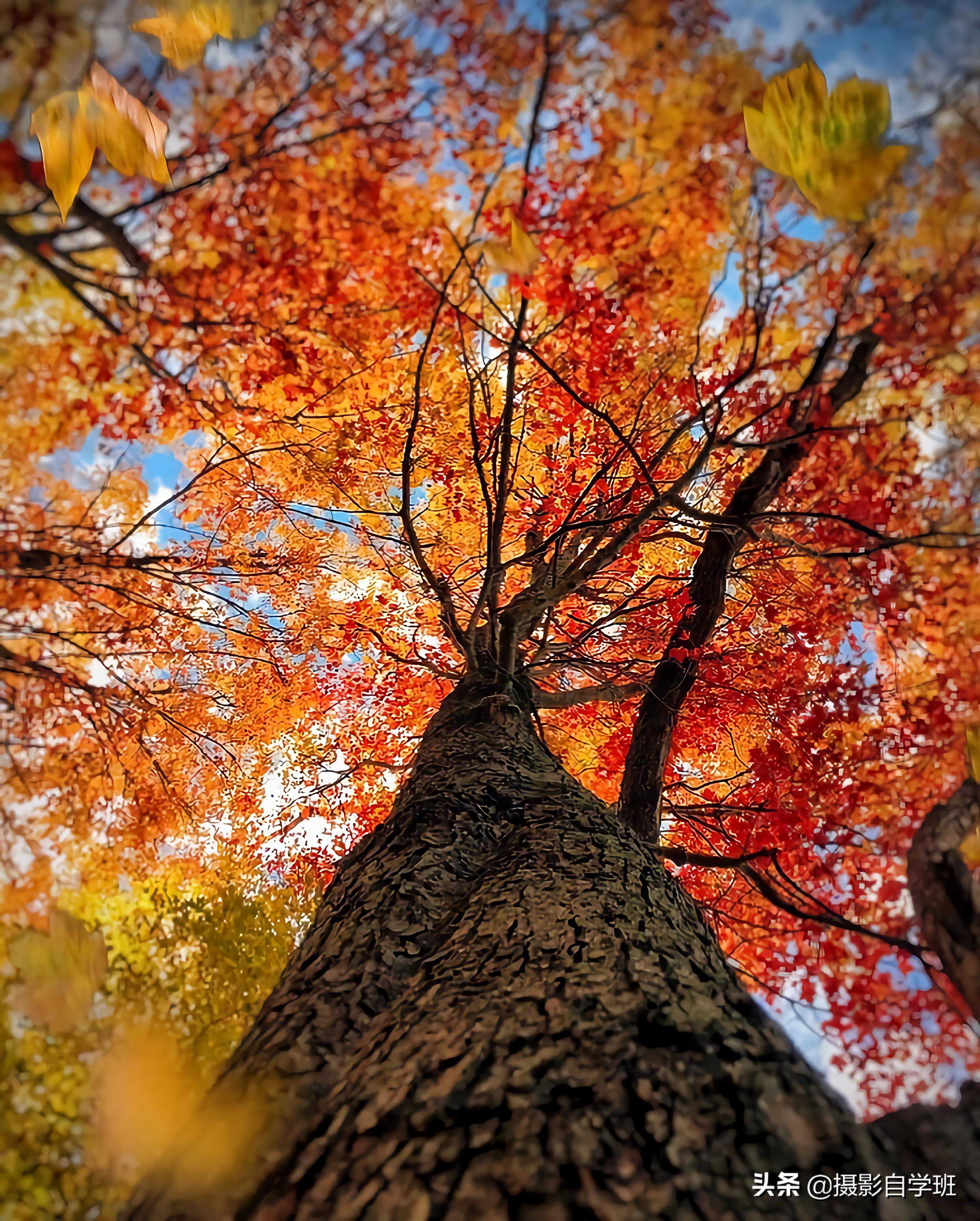 光线对于摄影来说,非常重要,尤其在拍摄风光照片的时候,等来好看的光线,会让画面看起来更加绚烂,更加通透。像上面这张照片,与下面这张照片,在仰拍的同时,等到合适的光线,把树照亮,照片就能够看起来更加美丽了,使用两个规律叠,加在一起,就能够轻松获得上图与下图这种的大片。