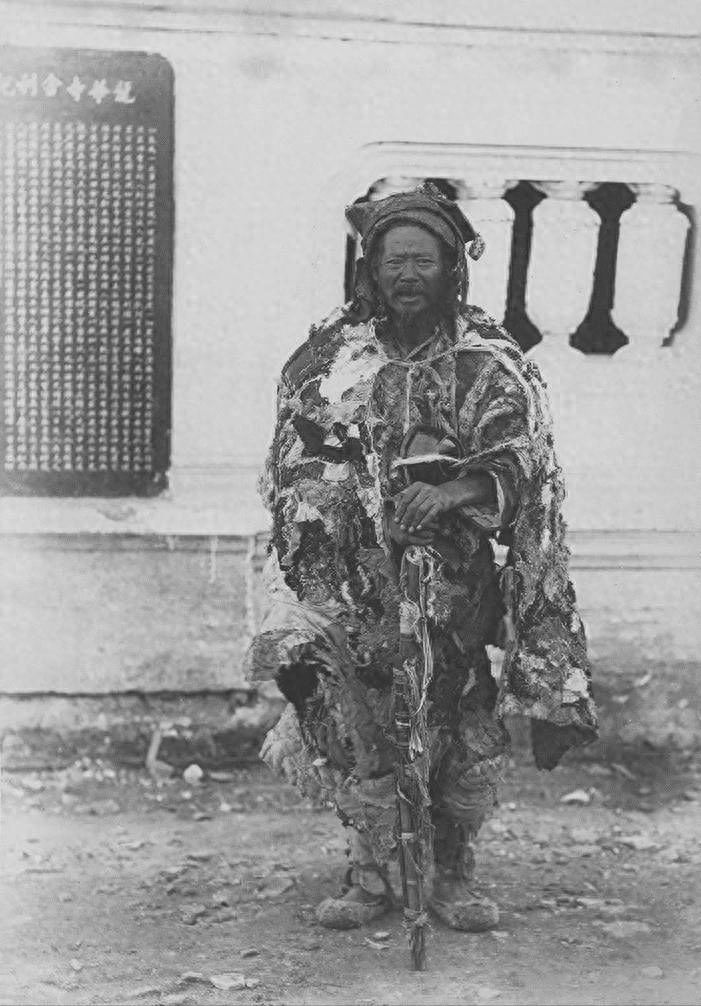 这名乞丐站在上海龙华寺前,衣衫破烂的情况触目惊心。