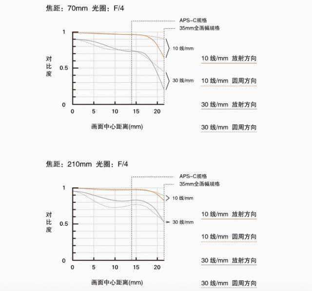 可以看到这支镜头在最大光圈下70和210mm的中心锐度都比较理想,但边缘成像却有所牺牲。