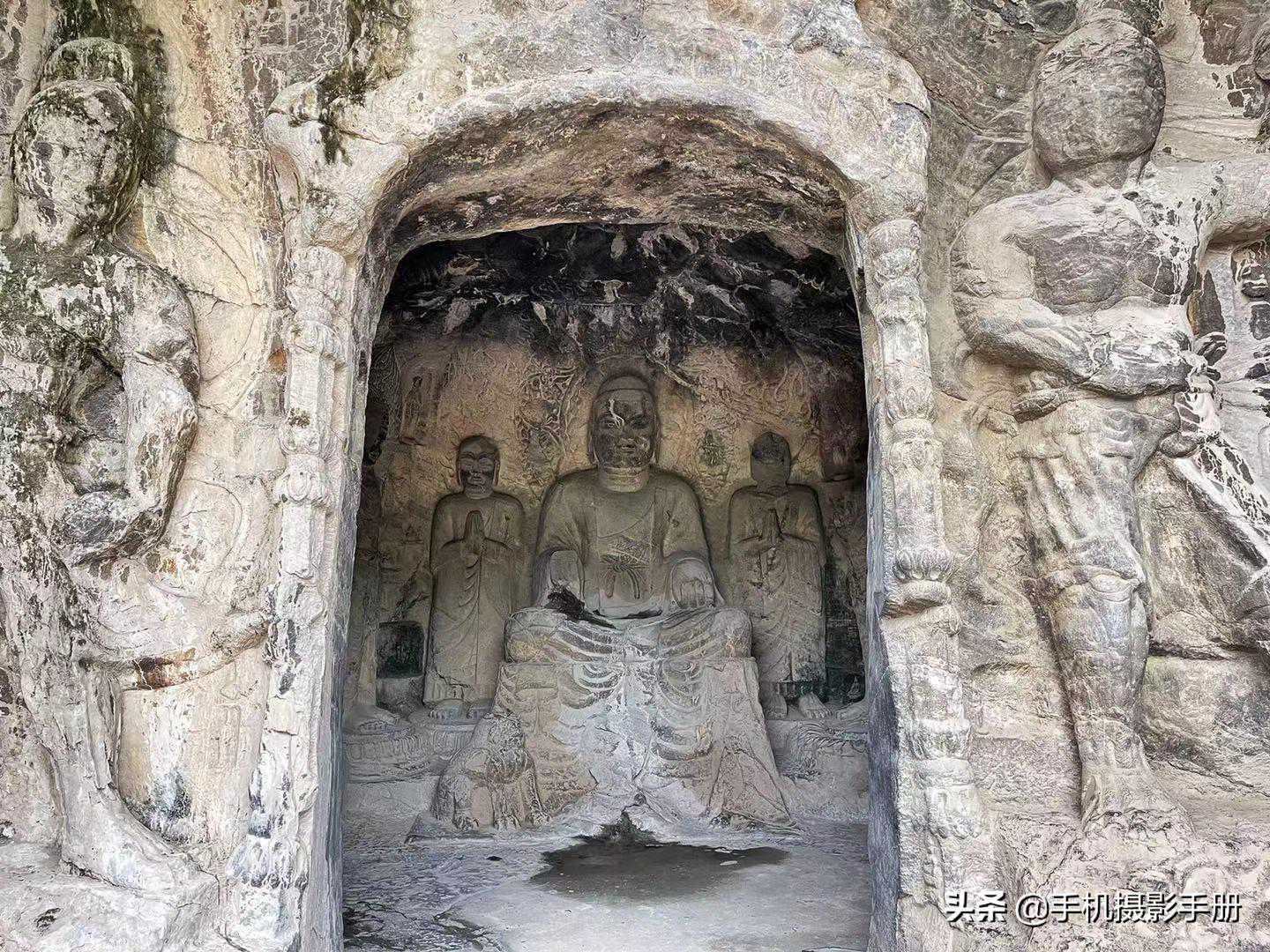 “唐高宗初,咸亨三年皇后武则天助脂粉钱两万贯,上元二年功毕。”就是说这些大佛当初都是附有彩绘的,武则天还做了资助。只是由于时间久远风吹日晒,现在基本都褪色了。
