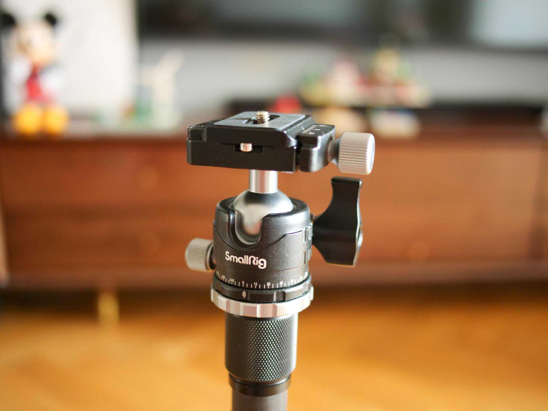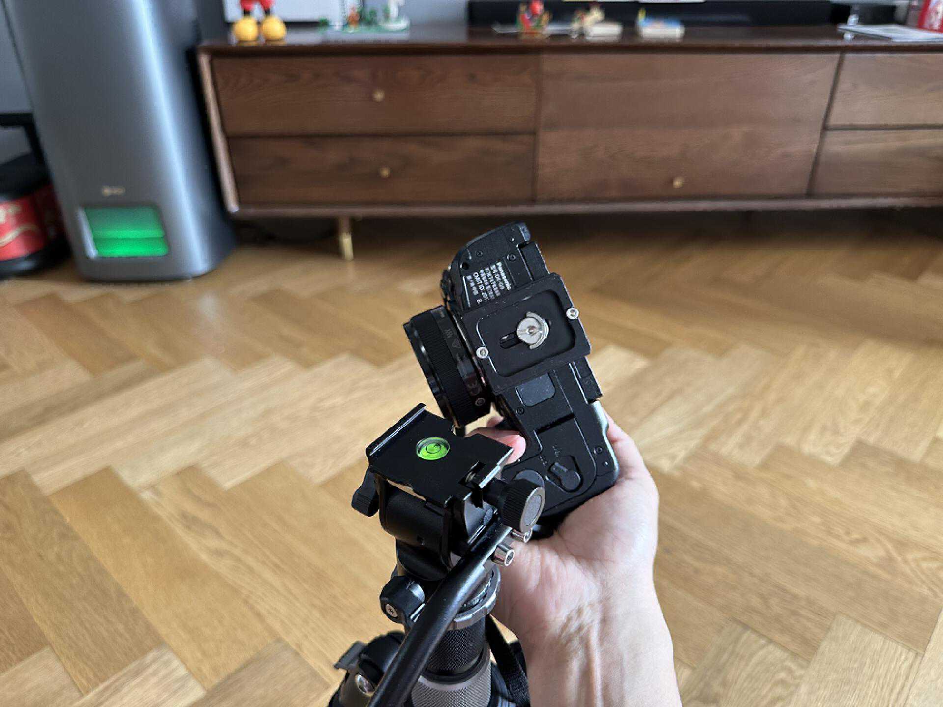 因为三脚架使用频率高,基本上用于连接相机和三脚架的支撑板一直安装在相机上,使用的时候直接卡在云台上,拧紧固定旋钮就行,操作起来非常便捷。