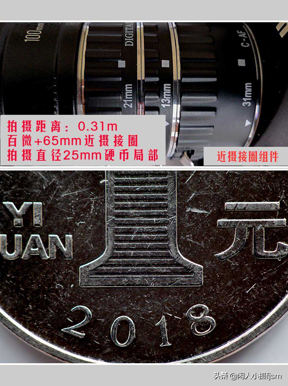 3-4,大部分的微距镜头(包括佳能百微),能够最大的实现1:1的“放大率”(影像比)的拍摄。如果要实现大于“1:1的放大率”(影像比)的拍摄,就需要通过外接近摄配件(如:近摄接圈,近摄镜等)来实现。就如下面图例中的1元硬币的局部微距拍摄,是采用:百微镜头+65mm近摄接圈,在拍摄距离为0.31m下拍摄的。