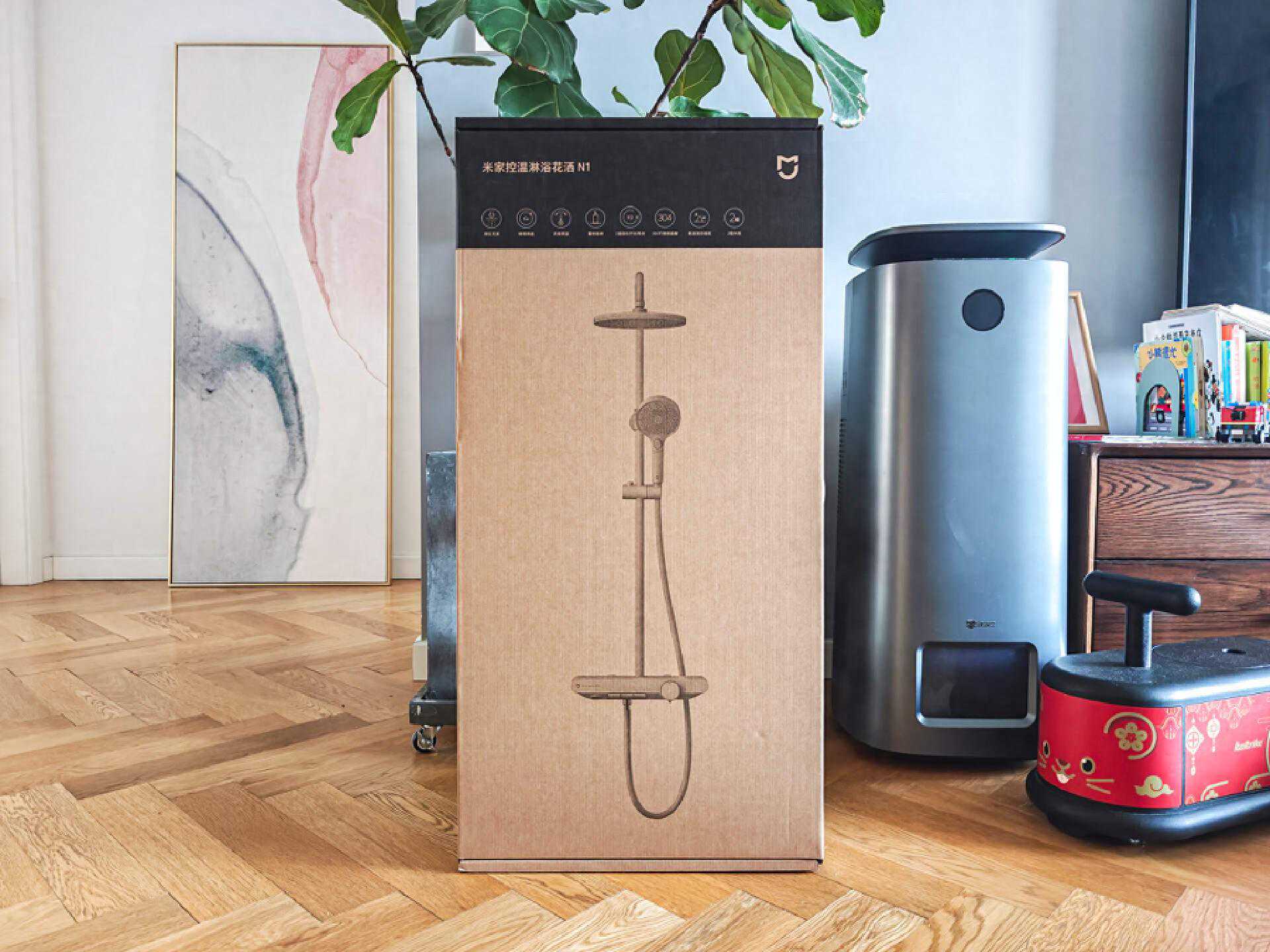 外包装依旧是米家统一的风格,坚固的本色牛皮纸箱包装,上面印有米家控温淋浴花洒N1的产品图。