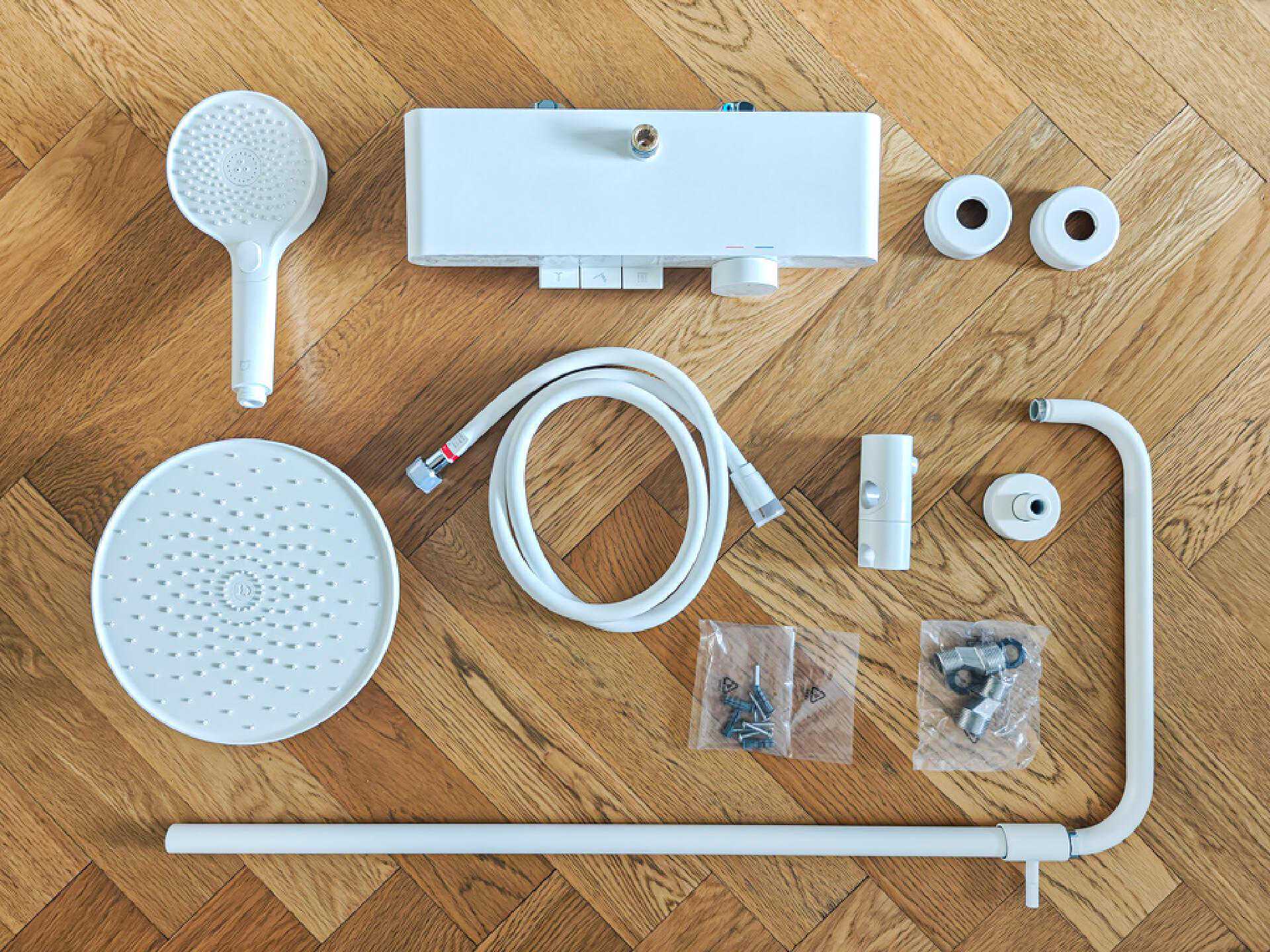 这次米家控温淋浴花洒N1采用了手持和喷枪二合一设计,所以配件没有之前体验过的S1多,算是正常带顶喷花洒的标配:顶喷、手持花洒、升降杆和软管这些主要的配件,以及安装用的曲柄对丝、装饰帽和升降杆固定柱。