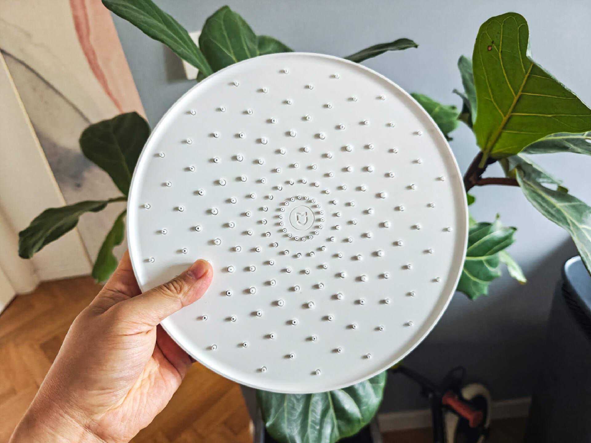 顶喷是9英寸大直径太阳花顶喷,162个出水孔,同样使用的是高弹硅胶水嘴,水垢一揉就净。