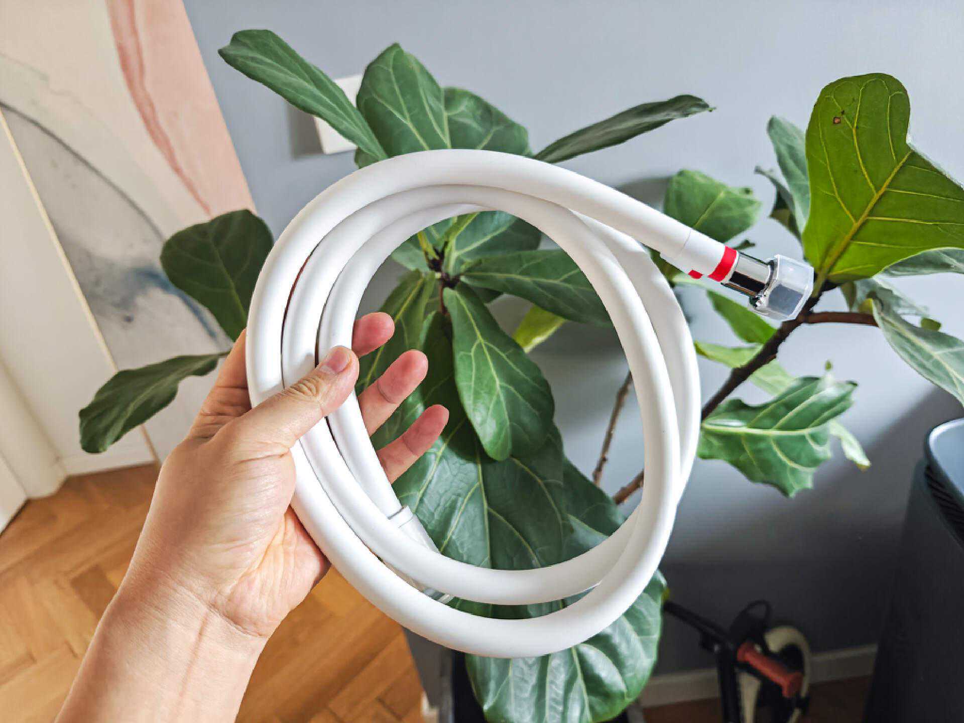 360°防缠绕的PVC软管,也是纯白色,一体包覆防烫不开裂,长期使用也不会像金属软管那样藏污纳垢,算是目前高端花洒的标配。