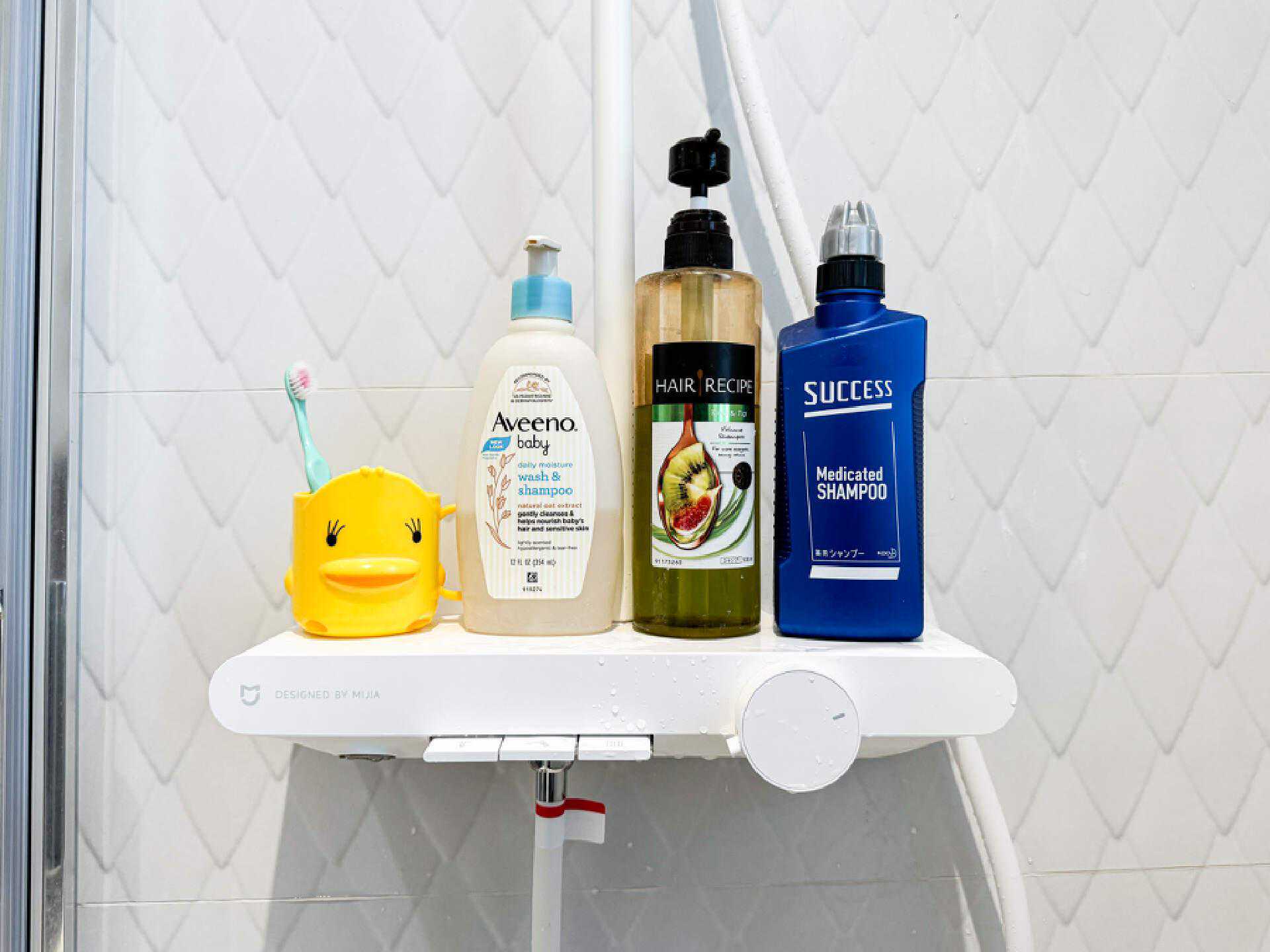 超大的置物台,再也不用摸高摸低的找洗发水了,而且一家三口的洗发水都能放下。