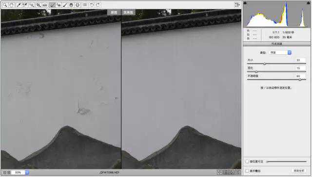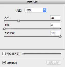我是用了这样的阙值(该滑块无数值),认为反差已经够了,就开始使用污点去除工具,开始使用上一次讲的污点去除工具。