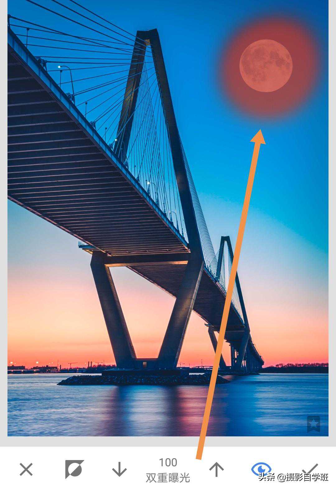 (2)我们也可以通过后期,为桥的照片添加月亮。用手机修图软件Snapseed打开桥的照片。