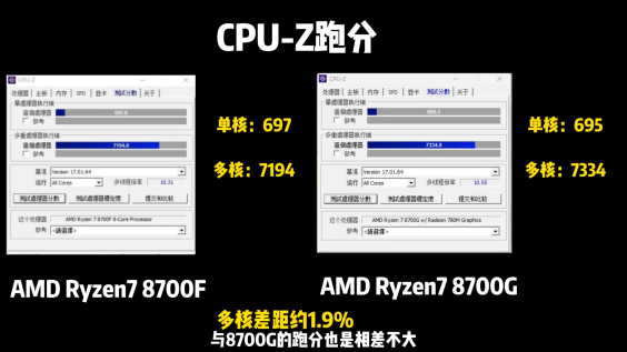 在CPU-Z平台上,Ryzen78700F的单核性能得分为697分,多核性能得分为7194分,Ryzen78700G的单核性能得分为695分,多核性能得分为7334分。