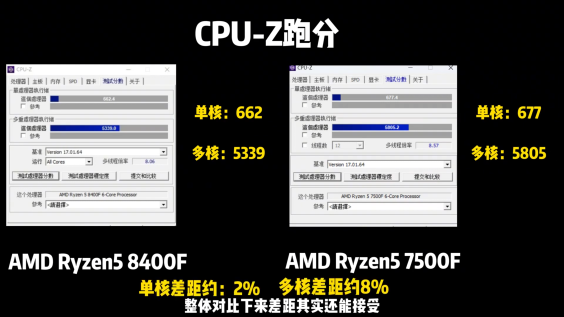 Ryzen58400F的单核性能得分为662分,多核性能得分为5339分。Ryzen57500F的单核性能得分为677分,多核性能得分为5805分。