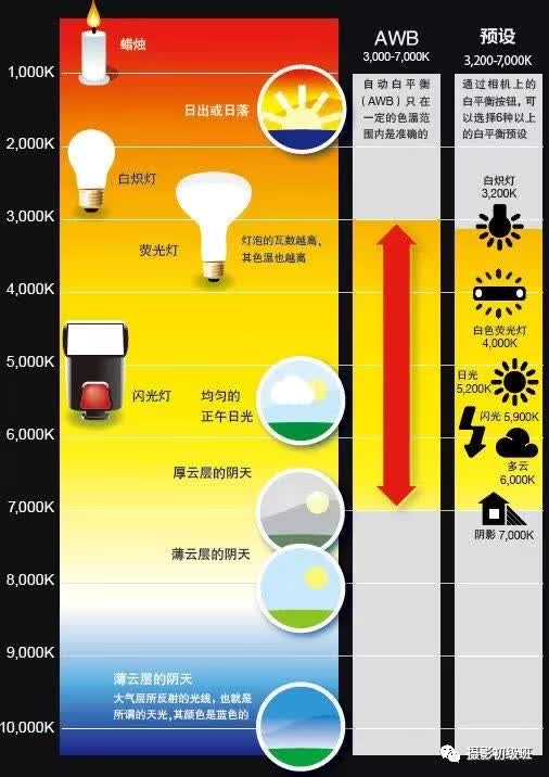 相机的色温范围,决定于你所使用的白平衡设置。下表中左侧的数值单位是开尔文(Kelvin)。