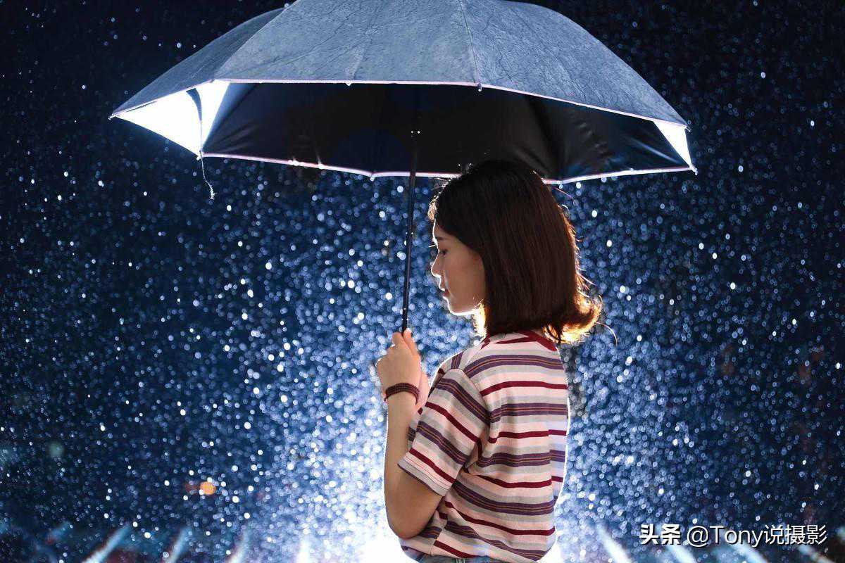 如下图,夜晚拍摄时,逆光营造水滴的反光,再使用补光灯对女生进行补光,既能实现雨滴的梦幻效果,又能保证女生的前方曝光正常。