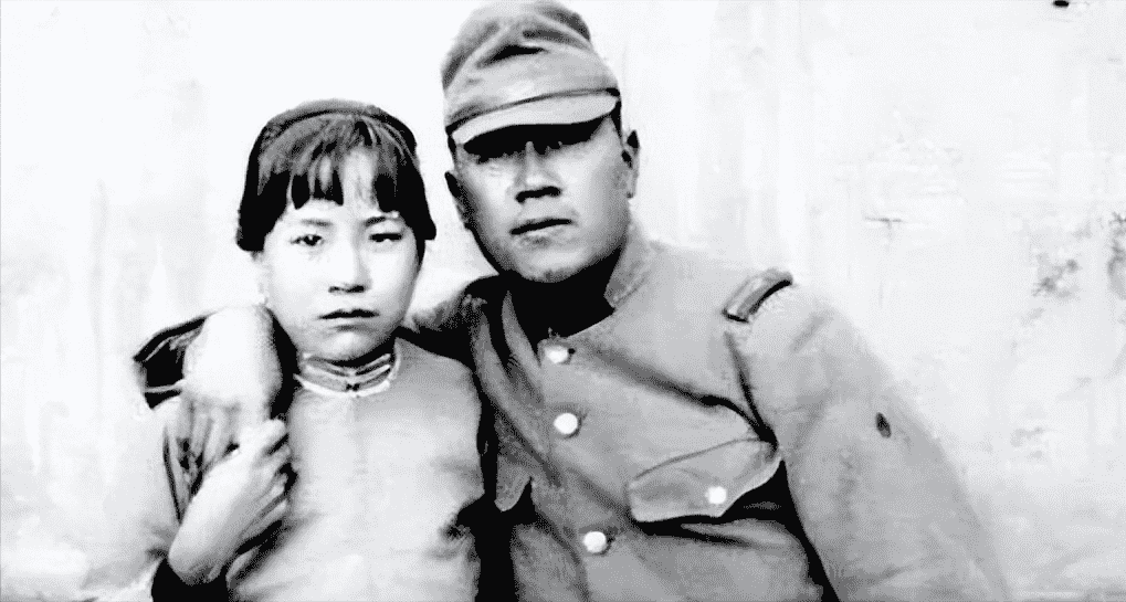 日军强行将手搭在女子的肩上,并要女子拉住他的手以显示亲密,女子恐惧的表情却戳穿了这一切。