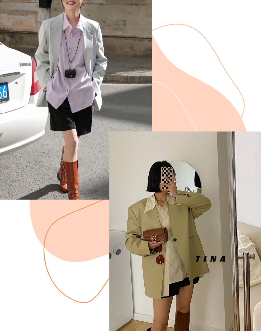 最基础的穿法就是简单的白t加西装,简约休闲,颜色也不受限制,如果想要打造腰线可以选择croptop或者背心加牛仔裤就很ok。