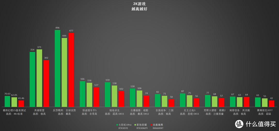 DX12是N卡强项,原本在2K分辨率下领先6600XT20%的3060Ti,这次优势扩大到了28%。3070则还是领先3060Ti大约19%,老黄的刀法正常时仍是每15~20%来一刀。