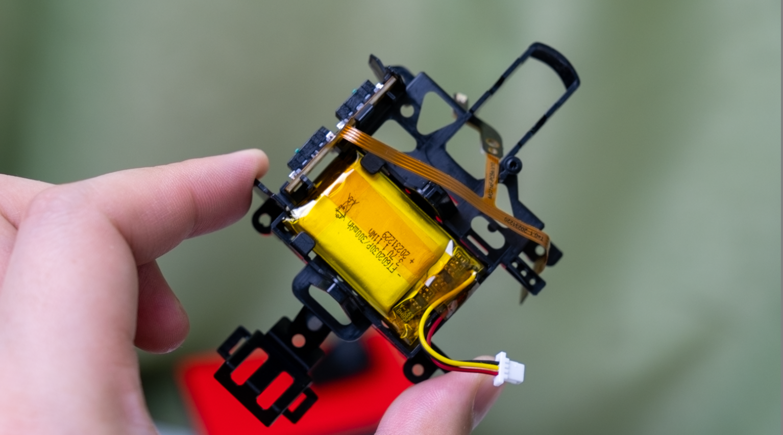 打开鼠标就能看到,这次月刃2ACE的内部用了一个类似中框的设计,电池,主板、侧键,后盖,滚轮这些核心部件都被固定在这同一个框架内,这个框架负责串联起鼠标的下半部分。