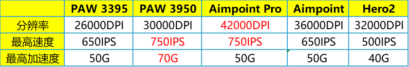 内部IC方面,无线IC依旧用的是诺迪克的nRf52840,传感器则是华硕独家的AimpointPro传感器,相关参数和对比如下。