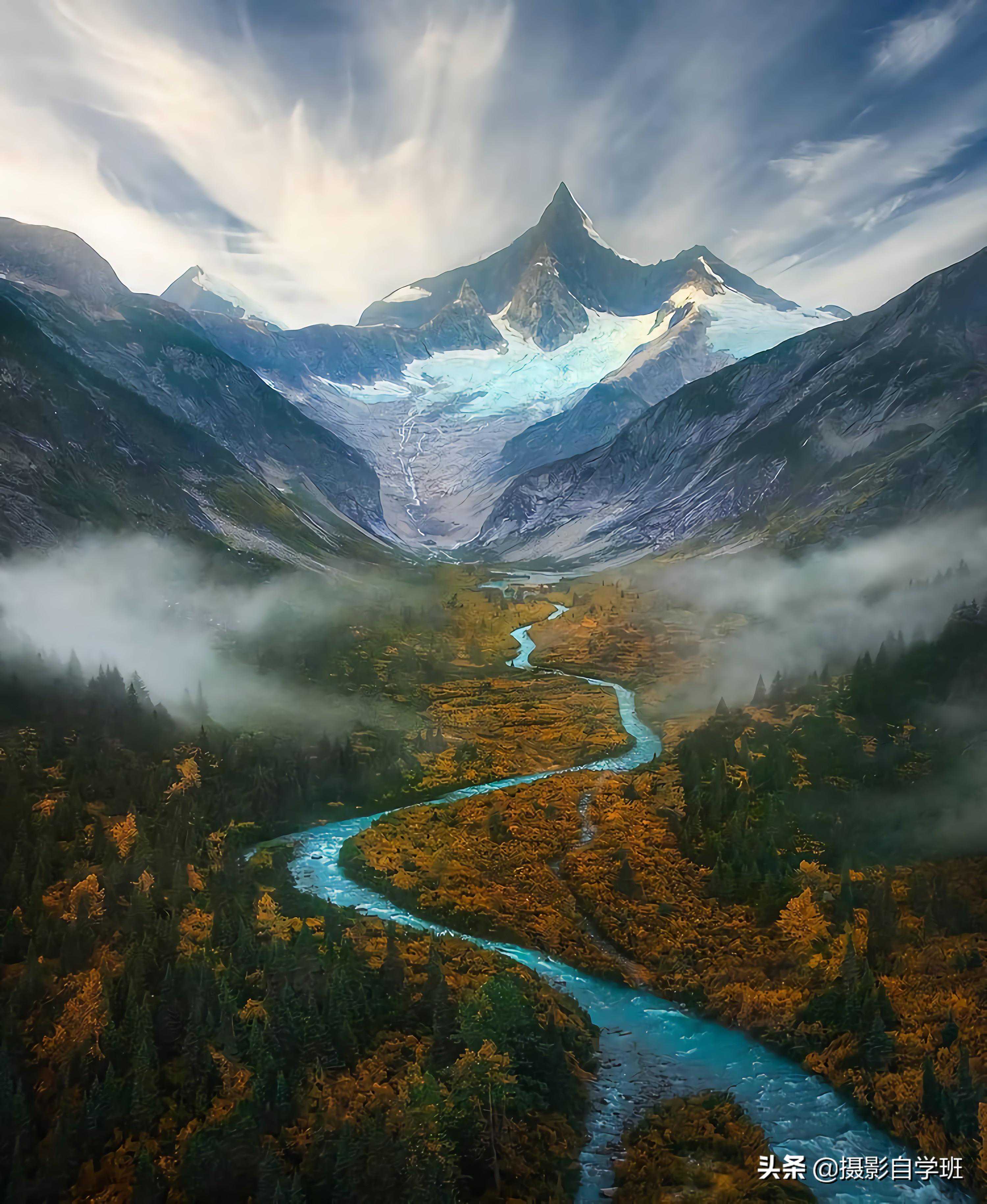 风光摄影中,也要学会用好线条。这个线条,指的是那些类似线条的景物,比如上图和下图中的河流。用好线条的方法,除了顺着线拍摄以外,还要带上三脚架,带上减光镜。这样在相机稳定的情况下,用滤镜,就能拍出上图,云如丝,水如雾的效果了。