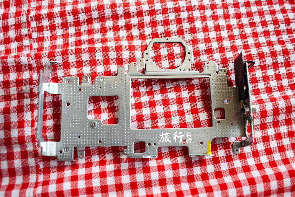 拆掉外壳后的相机底部,可以看到底部是单独的金属框架。