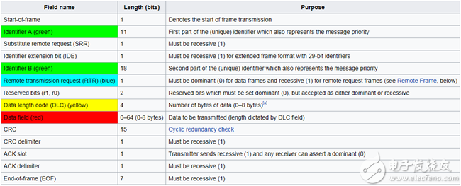 CAN总线中有标准帧和扩展帧两种格式,两种格式不同的地方在于仲裁域格式的不同,看下面两个表格可以很清楚的看出两者的不同,下面第一个表是标准帧(),第二个为扩展帧():
