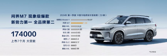 华为凭借30多年在ICT领域的技术积累,通过鸿蒙智行生态助力汽车行业合作伙伴商业成功,已展现明显优势。现象级爆款车型问界新M7上市7个月大定数达17.4万辆。2024年第一季度,问界新M7累计销量达到7.44万辆,斩获国内新势力单车型销量第一。