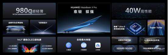 全新的华为MateBookXPro在此次活动上也正式亮相。追求极致轻薄与强大性能的完美结合,通过飞跃线设计让“轻”一眼可见。华为自研云隼架构巧妙地解决了笔记本轻量化与高性能难以平衡的问题,给出了华为笔记本之中轻且强的最优解。华为MateBookXPro厚度仅13.5毫米,重量仅980克,是1kg内唯一搭载Ultra9高性能处理器的笔记本,支持高达40W的性能释放!全新升级的华为鲨鱼鳍散热系统,将整体散热能力相比上一代升了37%,尽力确保处理器能够持久、畅快地释放性能。另外,SuperTurbo技术从底层调优,带来更优的功耗、更高效的性能、更流畅的使用体验。