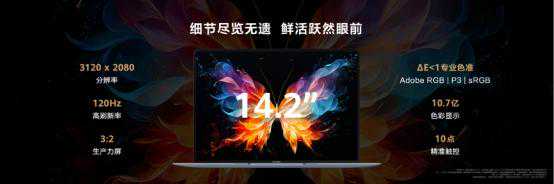 华为MateBookXPro是全球首款14.2英寸柔性OLED常规形态笔记本,14.2英寸的柔性OLED屏幕拥有93%的超高屏占比,分辨率3120x2080,PPI高达264,显示细腻没有颗粒感。色彩表现上,支持原生10.7亿色的色彩显示,在AdobeRGB、sRGB、P3三色域下均有∆E<1专业级色准表现,色彩精准还原。全屏亮度高达600尼特,显示HDR内容下1000尼特的峰值亮度。自研OLED显示增强算法以及出厂逐台校色的严苛标准带来了更真实、更清晰、更流畅的显示效果以及更舒适、更可靠的使用体验。