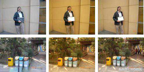 以下对比图像是使用理光CaplioGX100数码相机分别在三种情况下拍摄的照片,分别为自动白平衡、使用复印纸做白平衡,以及使用白平衡卡做自定义白平衡。我们可以直观地看出:使用自动白平衡(左图)的照片略微偏冷,如果没有对比的话整体色调还是可以接受的。使用复印纸做自定义白平衡(中间)的照片,明显偏黄,这是由于复印纸中含有大量的荧光增白剂,这种增白剂吸收紫外光并发出蓝色可见光,相机对着发蓝的白纸测光,就会使相机误认为蓝光过多,所以经过自定义白平衡修正后,图像反而会修正过度,因而偏黄。而使用数码相机专用白平衡卡设定的自定义白平衡(右图),则恰到好处,正确还原了应有的色温,不仅黑、灰等中性色还原正常,肤色表现也更好。