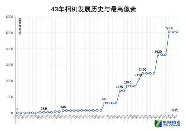 可以说43年间,135画幅数码相机的像素从1万上升到5000万像素,数码相机的传感器大小,从最初的1/3英寸,发展至全画幅,像素发展其实是传感器进步与处理器进步的双重结果。
