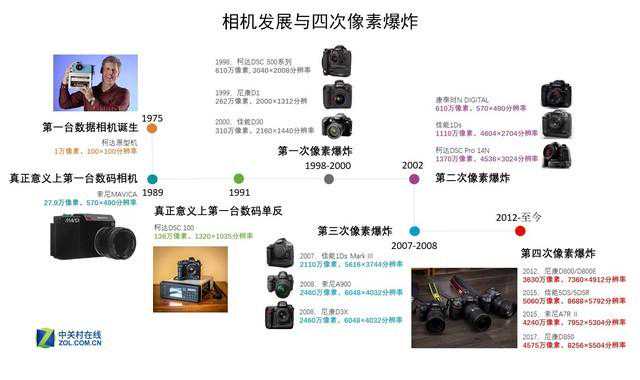 像素发展,依托的是技术进步和核心厂商的推动。可以看到,在1998年之前,数码135相机虽然经历了非常重要的发展历程,但是像素上并没有质变,并没有达到像素爆炸的效果。1998年之后,像素发展经历了四次爆炸,分别是: