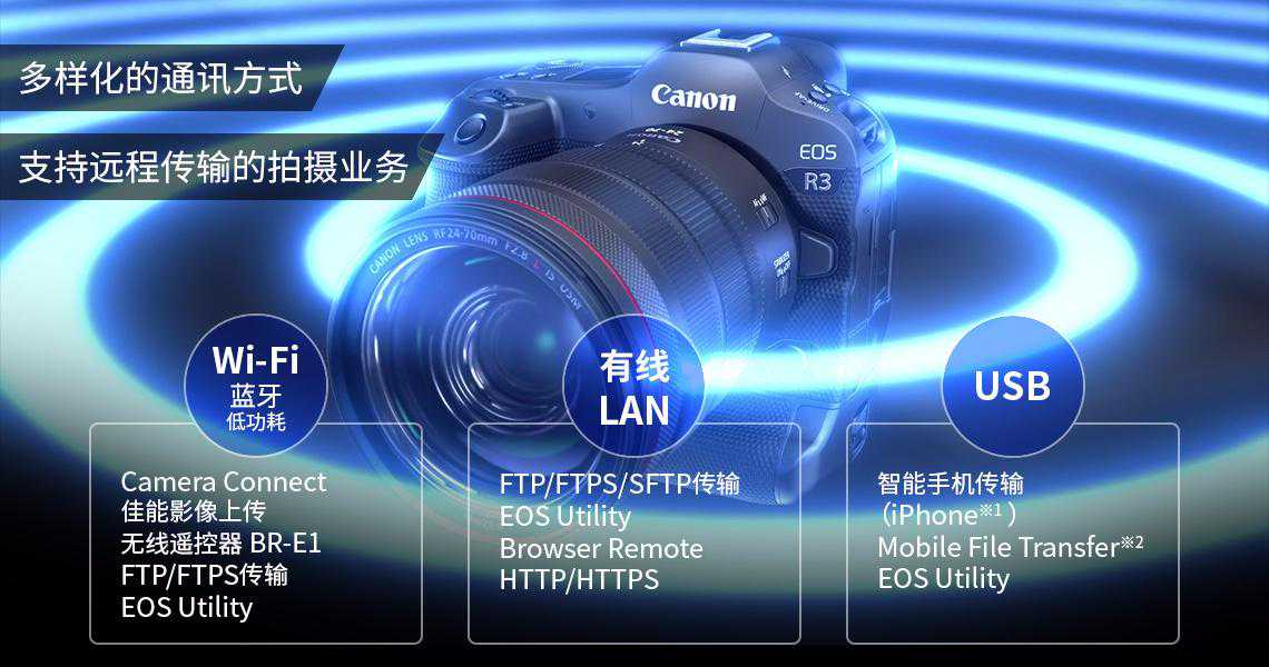 而在网络功能方面,EOSR3支持有线及无线等多种网络连接方式,可满足奋战在新闻报道、野外拍摄以及棚拍等一线专业摄影师不同的传输需求。EOSR3内置2.4GHz/5GHz频段的Wi-Fi通讯功能,支持/g/n/a/ac的规格。除了可通过智能手机应用程序CanonCameraConnect连接智能手机进行图像传输,还支持FTP等业务级图像传输。在EOSR相机系列中首次支持1000BASE-T以太网端子,可实现高速有线传输。通过USBType-C端子()可连接FTP,或通过EOSUtility实现文件高速传输及遥控拍摄。