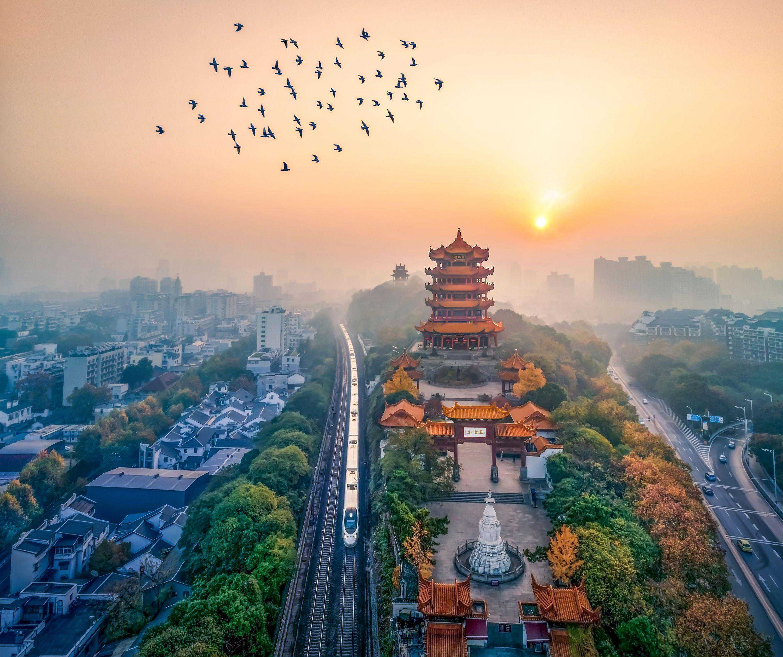摄影师汪常青创作的《鸟瞰古城》,为了捕捉到朝阳、黄鹤楼、高铁、飞鸟同框的最佳构图,从夏天一直追拍到冬天。夏天阳光强烈,黄鹤楼只有剪影,色彩出不来。那段时间,他疯狂地利用上班前的时间,在同一地点反复拍摄,终于在一个晴朗冬日的早晨,收获了自己最满意的画面。