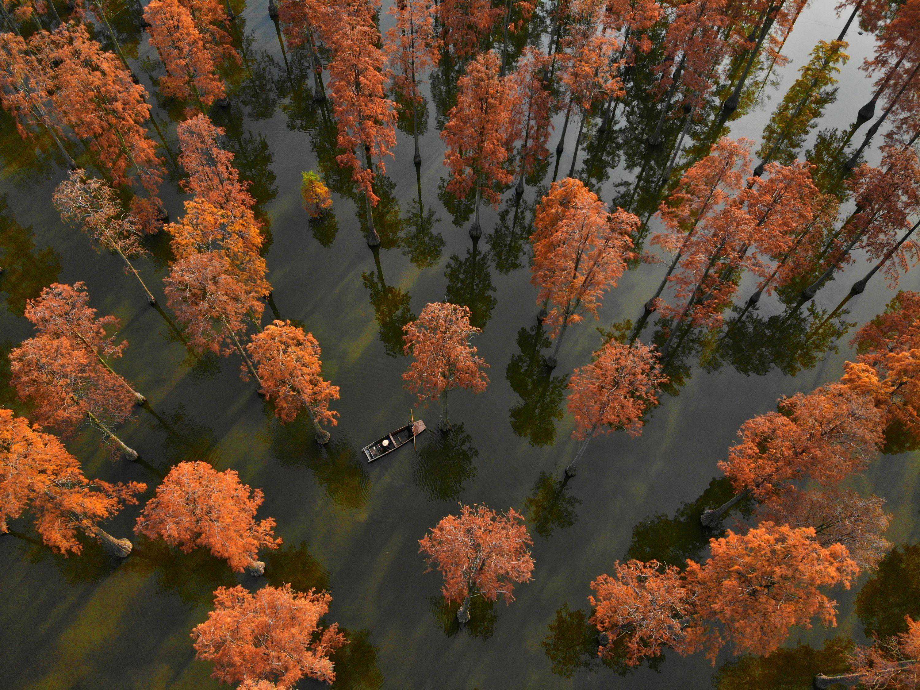 《水上森林别样红》,深秋时节的涨渡湖,林间静谧,水杉红艳,好生态引来白鹭栖息。城市摄影队邱新明摄