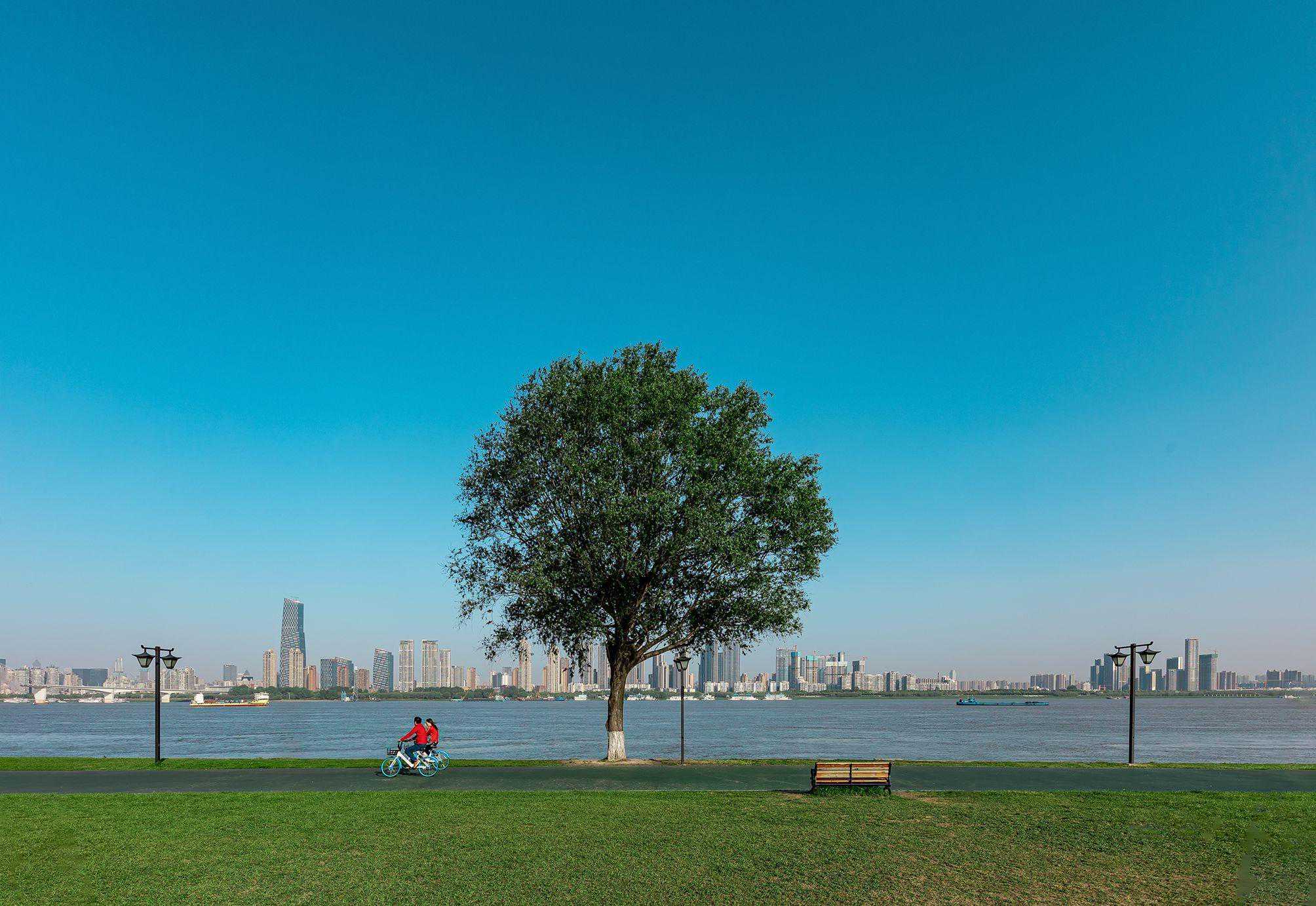 《孤独又灿烂的树》,武昌江滩,这棵孤独又灿烂的树成为“武汉的网红树”。有情侣穿上火红的“情侣装”来打卡,也成为一道风景。城市摄影队唐歌摄