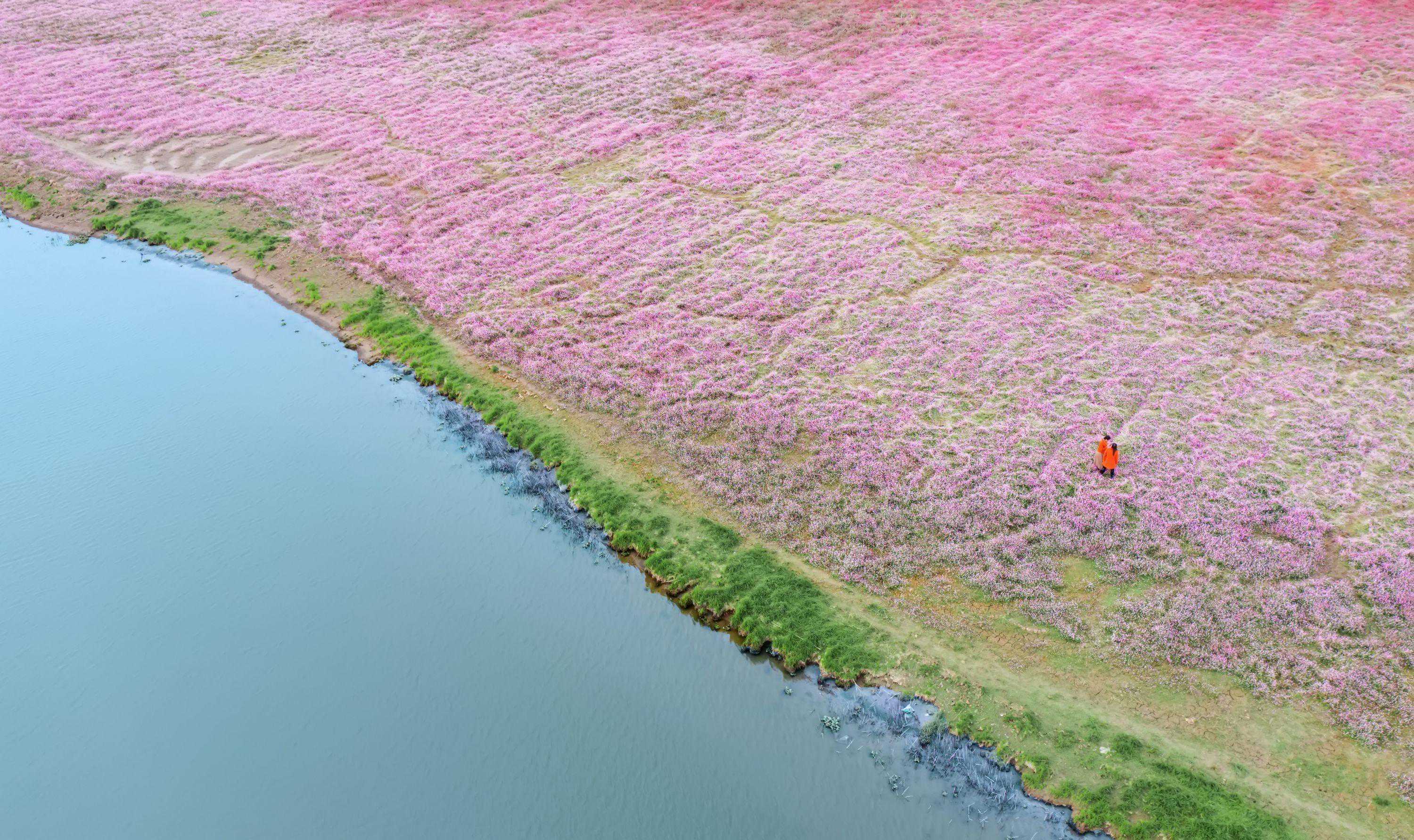 《湿地如画》,蔡甸区桐湖省级湿地公园内,数万平方米的蓼花进入盛花期,红白相间的花穗密集盛开,犹如粉色的花毯铺满河滩。城市摄影队靳进摄