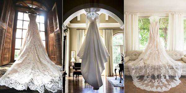 如果举办婚礼的地点是在户外,不妨将婚纱挂在树枝上拍一组照片,比室内看起来更加灵动。