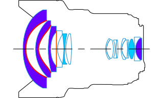 直线投影广角镜头可以说每1mm的缩短都会带来视角的剧烈变化,全画幅16mm的视角简单计算一下约为108度左右,缩短到14mm时可达约114度,12mm则来到约122度,11mm更是惊人的126度。结构基本都是反望远型,焦距越短设计难度就越大,因为这种前置负镜组设计会导致比较严重的失对称性(相对于孔径光阑),越是超广角,前组产生的像差就越大,增加整个镜组的调校难度。所以超广角镜头要解决的第一个问题就是前组的取舍,前组也是对超广角镜头性能影响最大的部分。