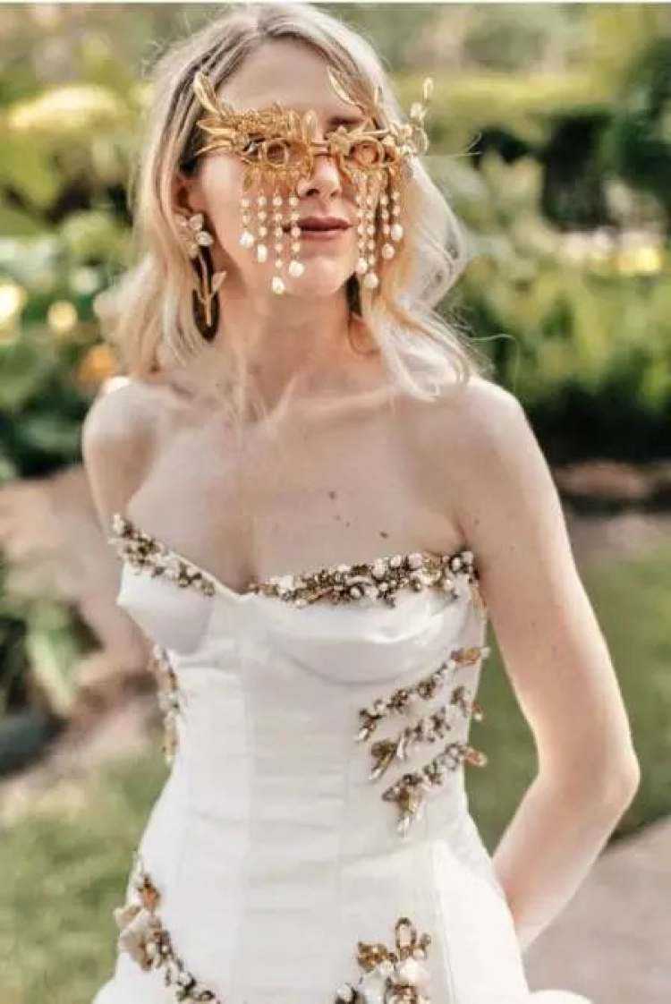 他从巴黎跳蚤市场挑了许多再生珠宝,把它们和珍珠、水晶、金属片绣在一块,连成了新娘胸前的骨骸纹路,配上金色的珍珠流苏眼镜,怪趣至极,很有“我走我路”的风范。