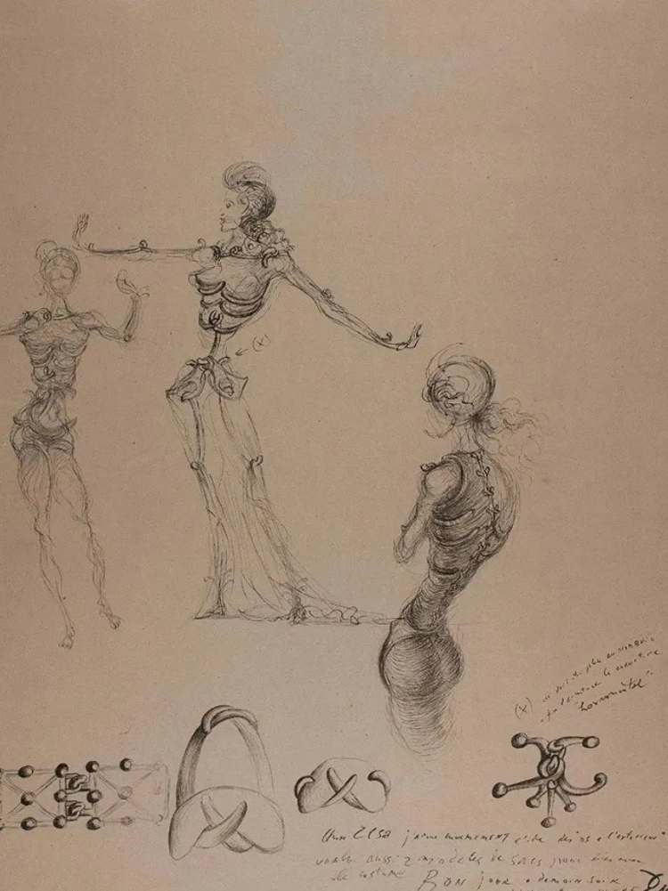 达利1938年画的手稿和同年ElsaSchaparelli设计的骨骸裙。