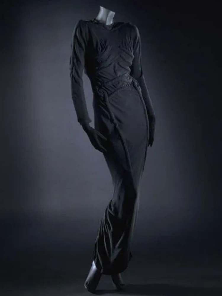 这件看起来是电影中女巫才会拥有的衣服,灵感据说来自达利的素描作品《骷髅女人》(TheSkeletonMan),以及后来ElsaSchaparelli根据画作设计的骨骸裙。