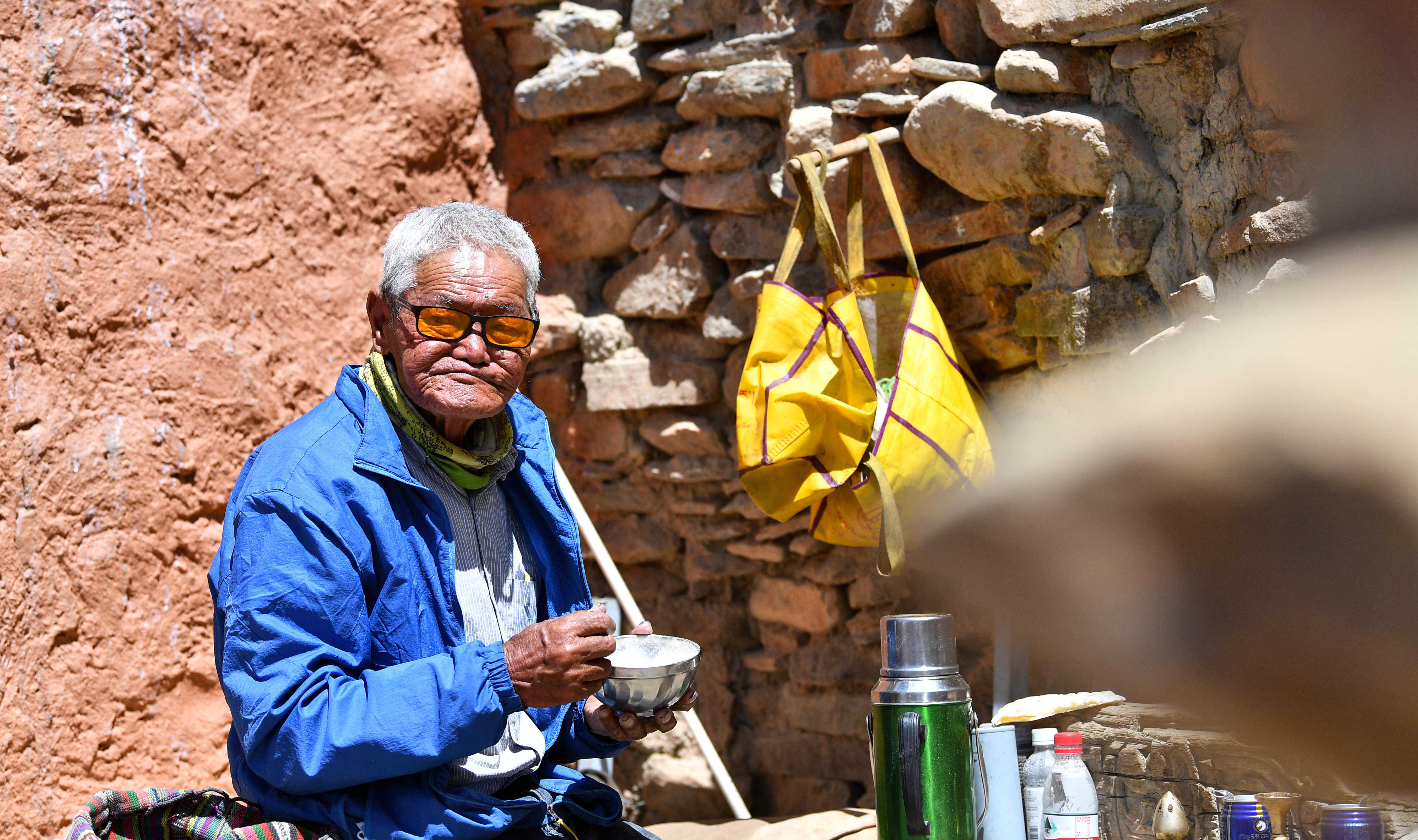仁增旺扎老人在石窟旁的空地上吃午饭(5月26日摄)。新华社记者晋美多吉摄