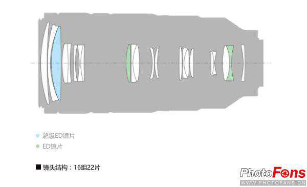 的镜头结构为16组22枚镜片,其中包括1枚超级ED镜片,2枚ED镜片,大大减少色差。同时搭载纳米抗反射涂层,在拍摄体育和野生动物题材时可减少不必要的反射。而在前端镜片上还搭载了氟涂层,这有助于防止污垢和指纹粘附,并使其更容易擦去污垢和指纹。