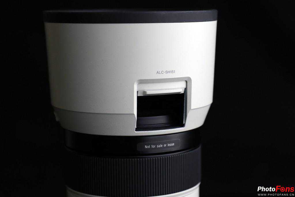 索尼还配备了一个型号为ALC-SH151的大型遮光罩,遮光罩上设有一个滤镜窗和一个锁定开关,滤镜窗可方便的进行滤镜的安装和更换。而锁定开关可保证遮光罩在使用时不会因意外而脱落。