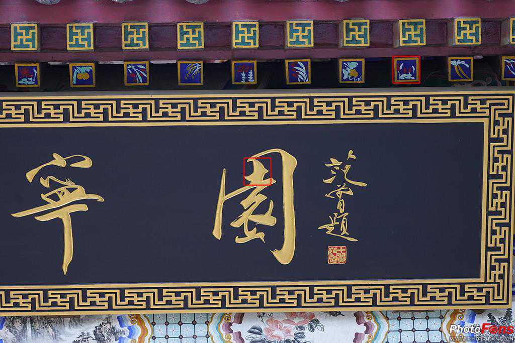 下面我们在实际场景中来对的分辨率进行一个测试。整个场景细节层次丰富,采用正面的构图也是尽量的保证画面边缘也可以在焦内,这样才能更好的反映出边缘的分辨率,做到相对客观。使用的相机为索尼全画幅微单™A9。首先测试的为100mm端。