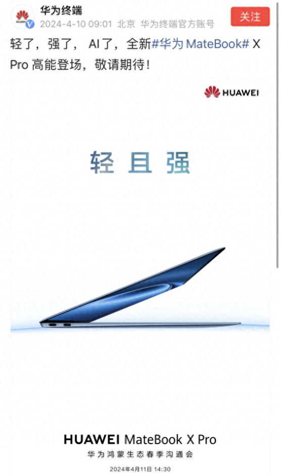 虽然预热海报并未透露出更多消息,但其中不难发现一些细节。海报以“轻且强”作为主题,展示出的新品图更像是全新华为MateBookXPro,似乎预示着其在轻薄度和性能方面将迎来重大升级。