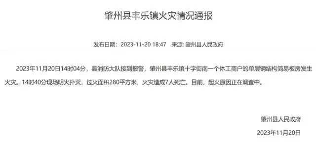 2023年11月20日,黑龙江大庆市一处个体工商户的单层钢结构简易板房发生火灾,过火面积280平方米,火灾造成7人死亡。