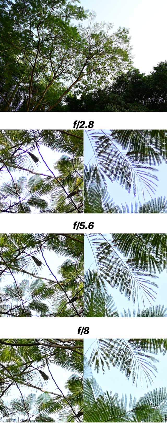 从实拍结果可以看到,全开f/2.8光圈时确实会有紫边,但个人感觉尚可接受。当收缩光圈后紫边便会消失不见。对直出JPG要求高的朋友,可适当收缩半档或一档光圈以减少紫边现象。