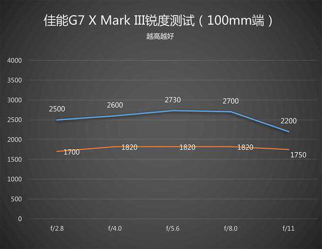 G7XMarkIII最高能输出5472×3648分辨率的照片,因此其横向、纵向数据极限理论上分别为2736和1824。从实际跑分来看,这款相机广角端在光圈下能达到最佳画质,长焦端的最佳画质则是在光圈,且在最佳画质下分辨率数据均能跑满。虽然在24mm端大光圈时的边缘画质有些偏肉,但就整体而言,这款小卡片的解析力已经足够好了。