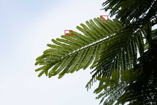 在高反差的的影调对比下,我们来看看不同光圈下画面的对焦中心和边缘成像对比,叶片的边缘颜色和天空自然过渡,即使在明暗交界最大的地方,紫边和绿边也没有出来作妖。佳能开发的UD镜片是具有低折射、低色散特点的光学镜片。通过采用超级UD镜片及UD镜片,提高了二次光谱的消除效果,两片UD镜片可实现与一片萤石镜片接近的效果,具有良好的色像差补偿性能。而一片超级UD镜片可提供相当于约两片UD镜片的效果,进一步为镜头的高性能化和小型化做出贡献。这么看起来,原片的叶子色彩也非常真实出彩了。